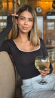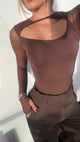 Body manga larga en encaje y transparencia, con escote en la espalda y tela de alta elasticidad.