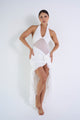 Vestido de baño entero en tres tonos de verde, con apliques metalicos.